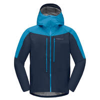 Die Y Lightline Air von Bergans wurde für Trekkingtouren entwickelt, bei denen jedes Gramm zählt. Daher beschränkt sich die Ausstattung der kurz geschnittenen Jacke auf eine Brusttasche und eine mittels Schnürzug anpassbare Kapuze. Leider riss der Zug nach kurzer Zeit einseitig aus, was auf Tour nicht repariert werden konnte (vom Bergans-Service später schon). Ansonsten leistete sich die ultraleichte Regenjacke in unserem Test 2023 keine Schwächen: Auf einer Zelttour über den Nordkalottleden hielt es tagelang gegenwindgetriebenem Dauerregen stand, zeigte keine Saugeffekte und dampfte top ab. Auch Sitz und Bewegungsfreiheit der aus überwiegend recyceltem Polyamid gefertigten Jacke überzeugen.