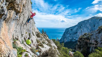 - La Poltrona: Bei einem ersten Besuch in Cala Gonone zieht der fast 200 Meter hohe Plattenschild alle Aufmerksamkeit auf sich. In den 80ern haben Altvordere wie etwa Heinz Mariacher hier ihre (bis heute anspruchsvollen) Spuren hinterlassen. An den insgesamt 65 Routen bis 7a+ wird vor allem glücklich, wer sich fürs Plattenklettern begeistern kann.
