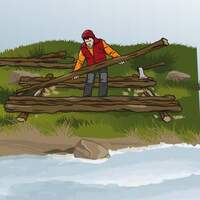 Platsch, platsch, platsch! Nach und nach rollen die Stämme für das Floß vom Lagerplatz über den Sand und klatschen ins Wasser. Ich schleppe, binde, ziehe, umwickel, knote fest – und schnaufe. Fredrik geht es mit seiner drei mal drei Meter großen Floßhälfte nicht anders. Immer wieder kommt Ing-Marie vorbei und hilft mir, meine Hände zu entknoten und die Holzstämme richtig zusammenzubinden. Jeder Knoten muss sitzen, denn schließlich soll das Floß nicht während der Fahrt auseinanderfallen. Nach gut vier Stunden ist es so weit: Wir verbinden die beiden Floßhälften.
